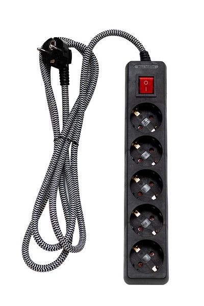 5-part extension cord with black and white fabric cord and on/off switch for indoor use. Plug and body part are black. Enclosure class IP20. Cable length 2 m. H05VV-F 3 x 1.5 mm².