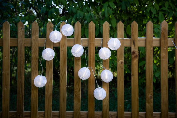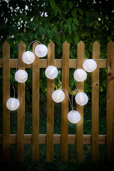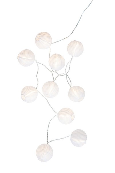 Traditional light string decorated with 10 white textile globe lanterns. Each ball has a diameter of 7.5 cm, and the distance between them is 25 cm. The warm white light shines beautifully through each lantern. The lantern set has two power sources – a solar cell and a transformer – and the transformer can be used when the sunlight is no longer strong enough to charge the LED light sources. The set contains 10 warm white LED lights, a 3-metre connecting cable, and an earth spike for the solar cell.