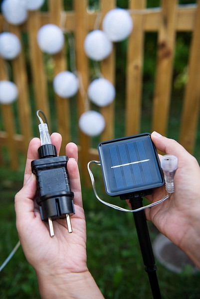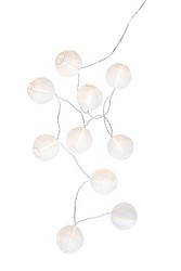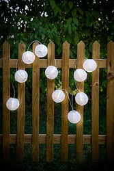 A set of 10 white ball lanterns. The set includes two power sources – a solar cell and a transformer – and these are simple to swap according to your needs. The set contains 10 warm white LED light sources.
