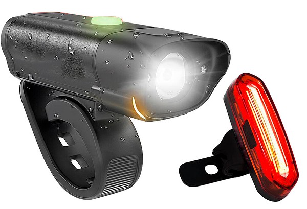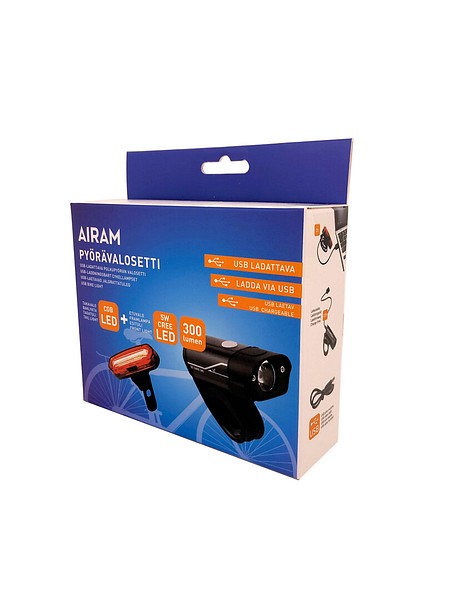 Rear lights became compulsory equipment on bikes in Finland on 1 June 2020. The set includes handy USB-rechargeable front and rear lights. The front light has three brightness levels, 100, 50 and 30%, in addition to a flashing mode. The red rear light is also adjustable (100–60%) and it offers a flash function at 100% brightness. The run time depends on the brightness level selected. At 100% efficiency, a single charge lasts 3.5–4 hours, while in flashing mode, the run time is up to 6.5–8.5 hours. The rear light takes 2 hours to recharge and the head light takes 3.5 hours. The package includes a USB cable. Both lights can be mounted on a bike with a handy, easy-to-use quick-release clamp.