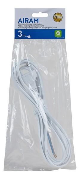 Cable with Euro Plug. Cord length 3 metres. Cord H03VVH2-F 2 x 0.75 mm². 2.5 A / 250 V.