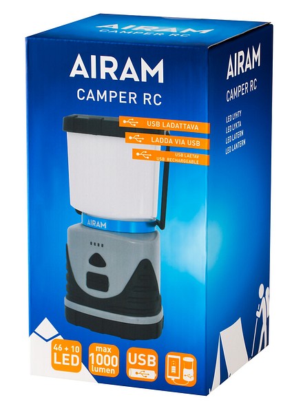 The compact USB rechargeable LED camping lantern lights up the darkness. The Camper RC lantern complements the selection of the versatile Camper lantern family. The compact size lantern is perfect for camping, cottage trips or picnics, for instance. Hang the lantern from its handle, or just place it on the ground or table. There are four blue charging indicator lights above the I/O switch: 25-50-75-100%. On the I/O switch, there are three adjustable light modes from bright white to warm dimmed light, a maximum of 1000 lumens. USB rechargeable. The lantern has a USB port to charge other devices as well.
