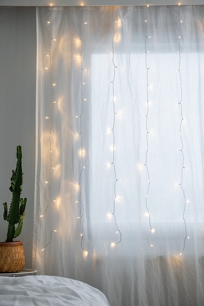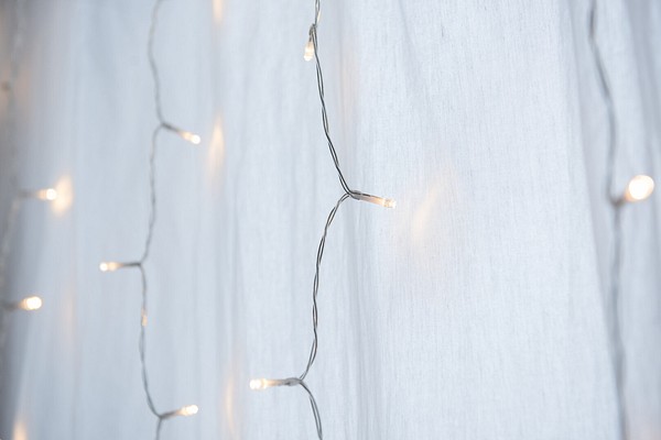 Curtain lights suitable for both indoor and outdoor use. Bring joy and luxury on your balcony, or hang the curtain lights in your living room behind a translucent curtain to create a festive atmosphere. Available in two different widths: 100 cm and 280 cm. The curtain height is 150 cm. The wide curtain contains 15 light chains, a total of 240 warm white LEDs. The narrow curtain contains 6 light chains, a total of 96 warm white LEDs. Adaptor 4.5 V 3.6 W IP44. Clear cord. Connector cord length 3 m.