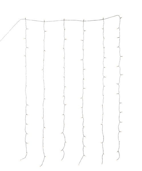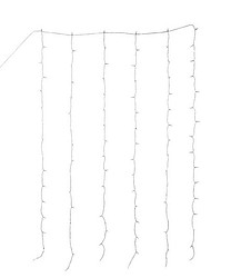 100 cm wide light curtain for both indoor and outdoor use. Add a stunning effect to your balcony or hang the light curtain behind a sheer fabric curtain in your living room. Height 150 cm, with 6 light strands and a total of 96 warm white LEDs. Transformer: 4.5 V / 3.6 W, IP44 rated. Clear cable with a 3 m lead wire.