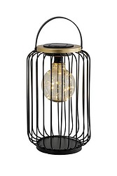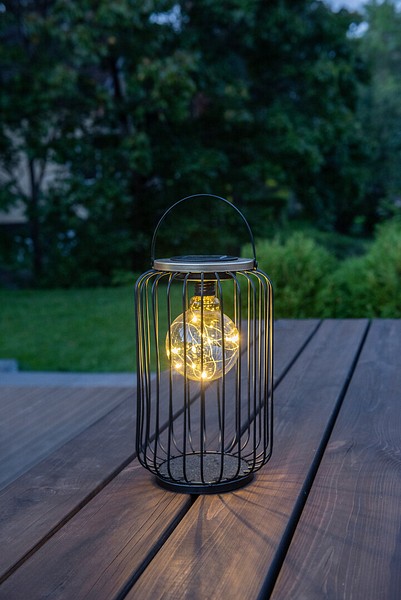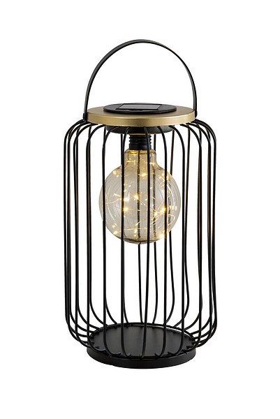 The shape of the Don solar lantern is stylish in its retro feel. Enjoy the ten LED lights that create a fun effect inside the bulb. Made of metal, shade: black and brass. Replaceable battery.