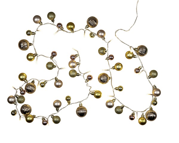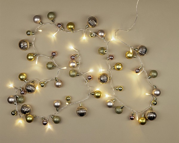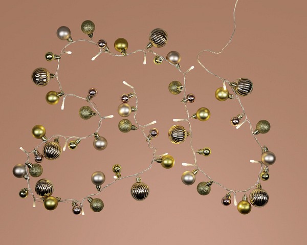 A festive decorative set for versatile use. In addition to the LEDs, the set comes with 48 ball-shaped ornaments of different colors and shapes: golden, glittering, rose gold or pink, larger, smaller, smooth and crimped – a truly stunning set! Suitable for indoor use.