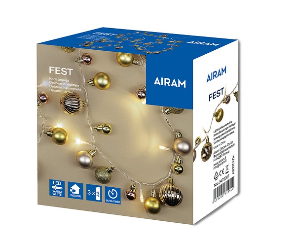 Fest is a festive decorative set for versatile use. LED 20 pcs. warm white, non-replaceable. 48 different ball-shaped ornaments. Light set length 1.9 meters. Batteries 3 x AA, not included. Features a timer function. For indoor use.