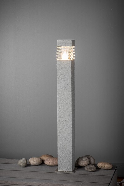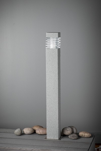 Stylish Kallio bollard light with a grey stone coating is perfect for your garden, height 900 mm. Steel frame and a clear tempered glass globe. The light requires a bulb that is narrower than standard options. Recommended bulb: P45 LED bulb or a narrow-bodied Airam Tubular LED bulb with E27 base. Light source not included in the package. IP44.