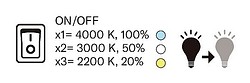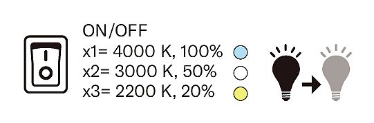 3-Step-CCT bulbs are controlled using a standard wall switch – no separate dimmer or controller is required. By clicking the switch within three seconds, you can stepwise adjust the light’s colour temperature (kelvin). As the colour of the light changes, the brightness (lumen output) also changes. The bulb first turns on at full output in cool white light (4000 K), the second switch press changes the light to white (3000 K) and reduces brightness, and the third press changes the light to warm white (2200 K) with further dimming – allowing you to easily adjust the atmosphere of your home to suit any situation. Memory function: when the bulb is switched off completely, the last light setting is retained. The G9 bulb does not have a memory function.