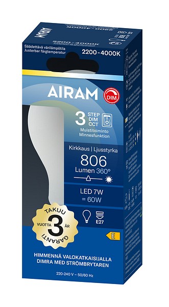 Opal standard-shaped 3-Step Dim series CCT LED bulb, dimmable with a standard switch, 7W. Color temperature options: warm white 2200K at 20% brightness / white 3000K at 50% brightness / cool white 4000K at 100% brightness. E27 base, 806 lm, lifespan approx. 15,000 hours, size ø 60 x 108 mm, cardboard packaging. Frequency ~50/60Hz. Good color rendering index CRI > 80. Continuous and stable spectrum, no color distortion. No UV or IR radiation. Does not contain mercury. Three-year warranty.