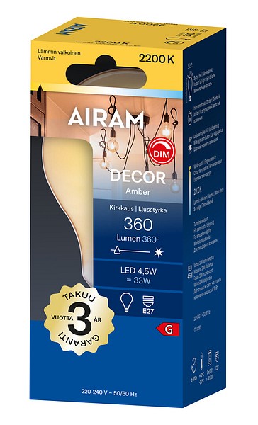 The antique-finished LED decorative lamps in the Amber series create a distinctive and atmospheric ambience at home. Dimmability is indicated by the DIM symbol on the packaging. Use only an LED-compatible dimmer. The omnidirectional, amber-tinted glass bulb emits warm and soft light also towards the base. Combined with a stylish lamp cord, the lamps make a striking feature even without a lampshade. Technical specifications are clearly presented on the packaging.