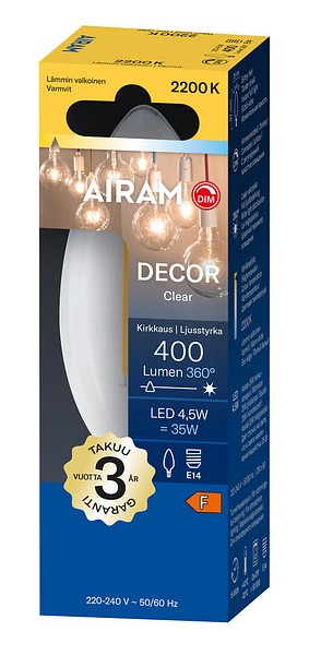 Clear-glass LED filament lamps emitting very warm light (2200 K) are ideal for creating atmospheric lighting in the home. The beautiful glass lamps emit light also towards the base, making them suitable for luminaires where the lamp is installed base-up. These decorative lamps are visually striking even without a shade. The lamps can be dimmed with an LED dimmer. Dimmable models are marked with the DIM symbol on the packaging. Technical specifications are clearly presented on the packaging.