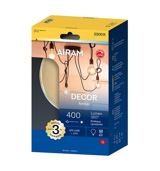The antique-finished LED decorative lamps in the Amber series create a distinctive and atmospheric ambience at home. Dimmability is indicated by the DIM symbol on the packaging. Use only an LED-compatible dimmer. The omnidirectional, amber-tinted glass bulb emits warm and soft light also towards the base. Combined with a stylish lamp cord, the lamps make a striking feature even without a lampshade. Technical specifications are clearly presented on the packaging.