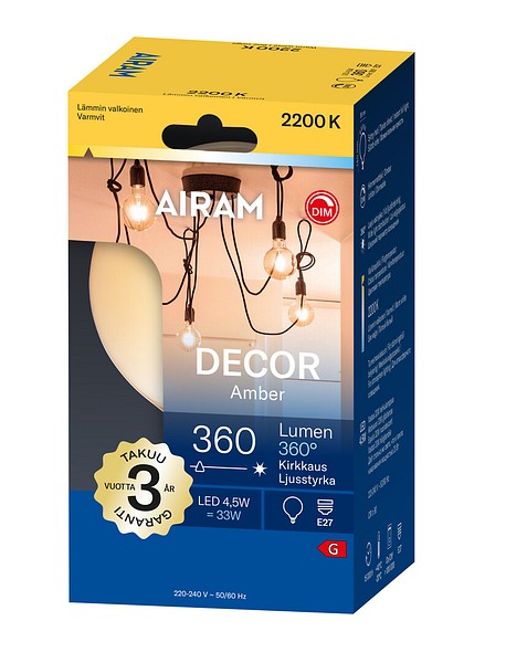 The antique-finished LED decorative lamps in the Amber series create a distinctive and atmospheric ambience at home. Dimmability is indicated by the DIM symbol on the packaging. Use only an LED-compatible dimmer. The omnidirectional, amber-tinted glass bulb emits warm and soft light also towards the base. Combined with a stylish lamp cord, the lamps make a striking feature even without a lampshade. Technical specifications are clearly presented on the packaging.