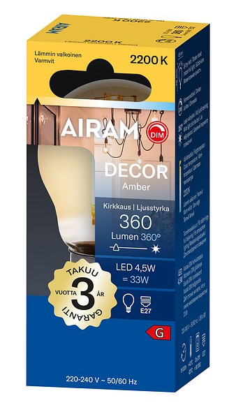 The antique-finished LED decorative lamps in the Amber series create a distinctive and atmospheric ambience at home. Dimmability is indicated by the DIM symbol on the packaging. Use only an LED-compatible dimmer. The omnidirectional, amber-tinted glass bulb emits warm and soft light also towards the base. Combined with a stylish lamp cord, the lamps make a striking feature even without a lampshade. Technical specifications are clearly presented on the packaging.