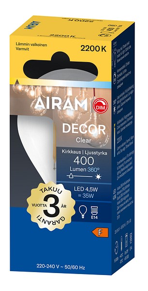 Clear-glass LED filament lamps emitting very warm light (2200 K) are ideal for creating atmospheric lighting in the home. The beautiful glass lamps emit light also towards the base, making them suitable for luminaires where the lamp is installed base-up. These decorative lamps are visually striking even without a shade. The lamps can be dimmed with an LED dimmer. Dimmable models are marked with the DIM symbol on the packaging. Technical specifications are clearly presented on the packaging.