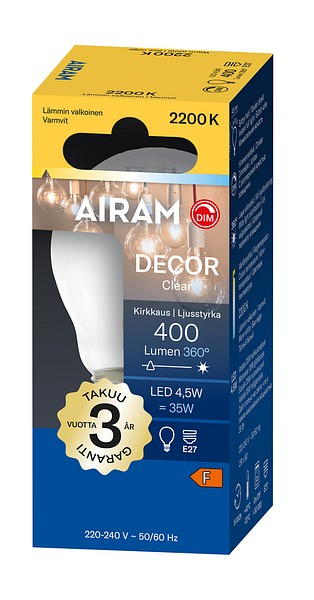 Clear-glass LED filament lamps emitting very warm light (2200 K) are ideal for creating atmospheric lighting in the home. The beautiful glass lamps emit light also towards the base, making them suitable for luminaires where the lamp is installed base-up. These decorative lamps are visually striking even without a shade. The lamps can be dimmed with an LED dimmer. Dimmable models are marked with the DIM symbol on the packaging. Technical specifications are clearly presented on the packaging.
