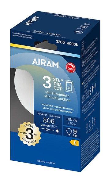 Opal globe-shaped 3-Step Dim series CCT LED bulb, dimmable with a standard switch, 7W. Color temperature options: warm white 2200K at 20% brightness / white 3000K at 50% brightness / cool white 4000K at 100% brightness. E27 base, 806 lm, lifespan approx. 15,000 hours, size ø 95 x 140 mm, cardboard packaging. Frequency ~50/60Hz. Good color rendering index CRI > 80. Continuous and stable spectrum, no color distortion. No UV or IR radiation. Does not contain mercury. Three-year warranty.