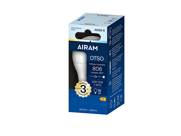 SMD lamps feature a plastic neck. The LEDs are positioned on the surface of the neck section inside the lamp bulb, which means SMD lamps do not emit light towards the base. Depending on the luminaire, the neck may appear as a slightly darker shadow in the surroundings. Otso SMD LED standard lamps 4000 K provide cool white light. The range includes a comprehensive selection of opal-bulb lamps in various shapes with E14 or E27 bases.
