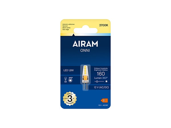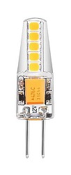 Clear bulb-cover LED lamp, 12V 1.6W, color temperature warm white 2700K, G4 base, 160lm, lifespan approx. 15,000 hours, size ø 10 x 38 mm, blister package. Frequency ~50Hz. Operating temperature range -30 ... +40°C. Good color rendering index CRI > 80. Continuous smooth spectrum, no color distortions. No UV or IR radiation. Mercury-free. Three-year warranty.