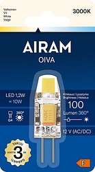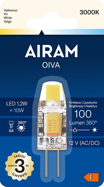 Bulb-shaped LED lamp 12V 1.2W, color temperature pure white 3000K, G4 base, 100lm, lifespan approx. 15,000 hours, size ø 10 x 34 mm, blister pack. Frequency ~50/60Hz. Operating temperature range -30 ... +40 °C. Good color rendering index CRI > 80. Continuous smooth spectrum, no color distortion. No UV or IR radiation. Mercury-free. Three-year warranty.