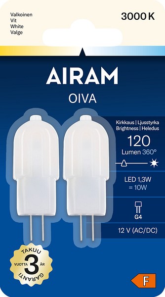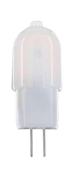 Bulb-shaped LED lamp 12V 1.3W, color temperature pure white 3000K, G4 base, 120 lm, lifespan approx. 15,000 h, size ø 12 x 37 mm, 2 pcs blister pack. Frequency ~50/60 Hz. Operating temperature range -30 … +40 °C. Good color rendering index CRI > 80. Continuous, even spectrum with no color distortion. No UV or IR radiation. Mercury-free. Three-year warranty.