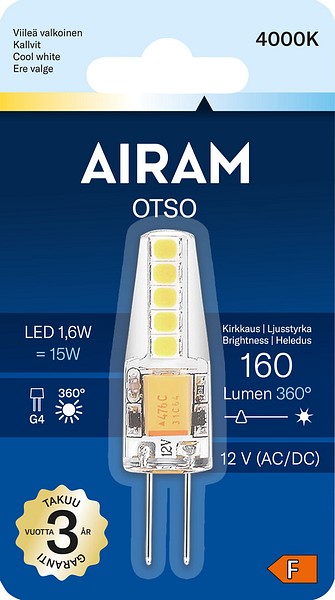 Bulb-shaped LED lamp 12V 1.6W, color temperature bright white 4000K, G4 base, 160lm, lifespan approx. 15,000 hours, size ø 10 x 34 mm, blister pack. Frequency ~50Hz. Operating temperature range -30 … +40 °C. Good color rendering index CRI > 80. Continuous smooth spectrum, no color distortion. No UV or IR radiation. Mercury-free. Three-year warranty.