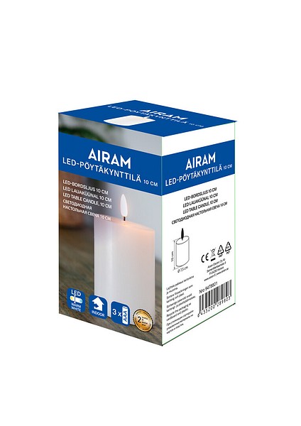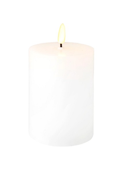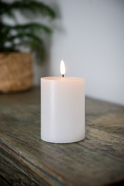 The LED table candle with a wax surface looks authentic, but is completely fireproof. Decorate your house or create intimate table settings. The warm white LED flickers like the real thing. Powered by 3 x AAA batteries. Batteries not included. On/off switch and a timer. Available in two different heights: 15 cm or 10 cm.