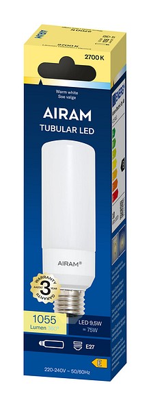 The bulb of a Tubular LED lamp has a long, slim, cylindrical shape. The light output covers the entire surface of the lamp. Tubular lamps are especially suitable for luminaires where a standard bulb does not fit and/or where an even light distribution across the whole luminaire is desired. Technical specifications are clearly presented on the packaging. Available colour temperatures are warm white and cool white (2700 K and 4000 K).