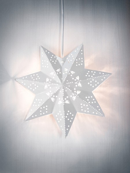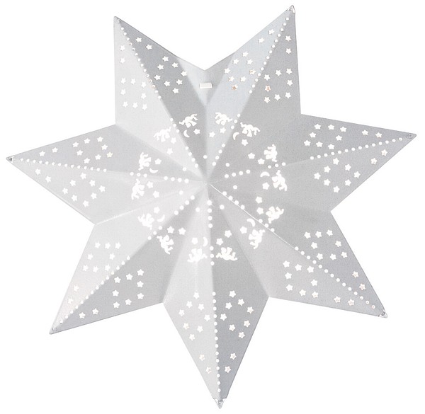 A white metal star illuminated by an LED series inside the star. LED warm yellow, non-replaceable, connected to a series of 10 LEDs. Material: metal. Cord: clear. For indoor use. Transformer: 31V 3.6W IP20.