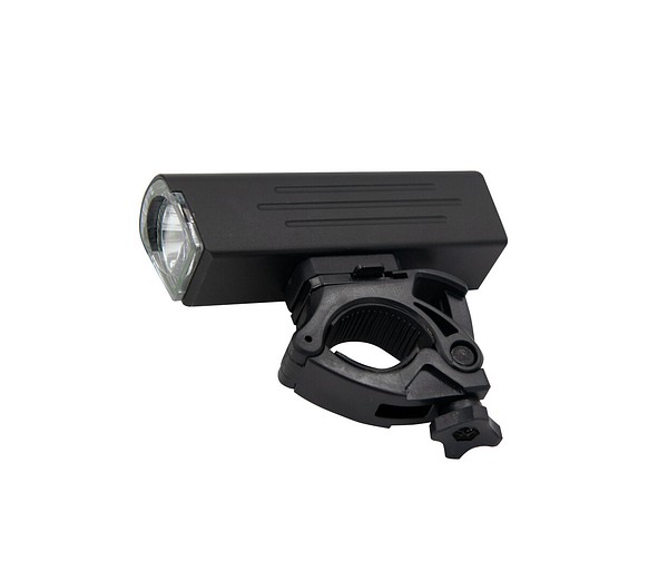 A powerful USB-rechargeable bicycle front light. Easy to mount on the handlebars with a screw-adjusted loop. The light can be detached from the mount by pressing down on the catch and pushing the light forward. A splash-proof charging port at the rear, on/off button on the top. The light features various functions. A single press of the button allows you to cycle through the different intensity levels, double press activates the flash and SOS modes.