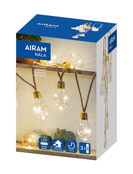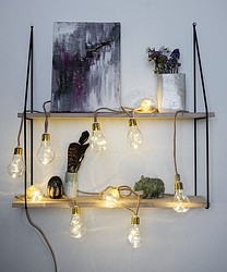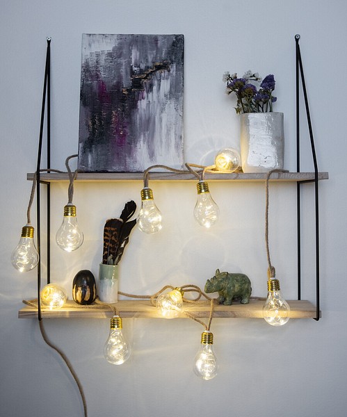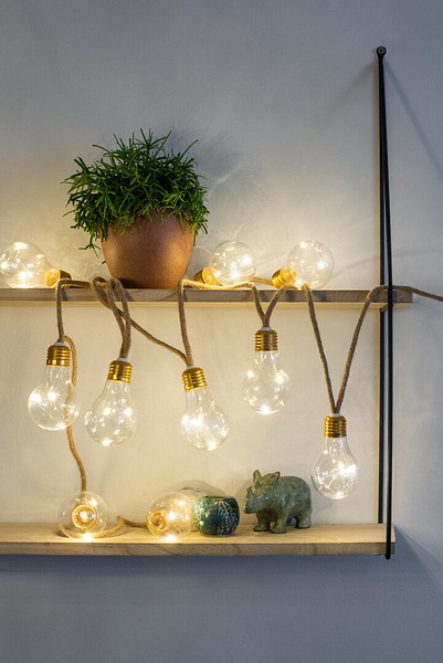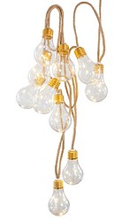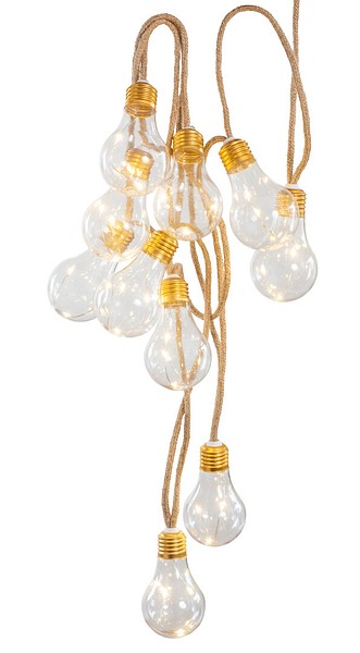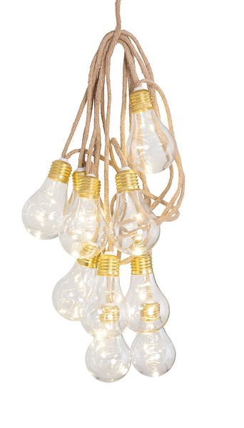 A series of 10 lamps. Each lamp contains three warm white LEDs. The dome of the lamp is clear and the cap is brass-hued. The jute on the surface of the cord gives the series a stylish and rustic look. Batteries not included. Made of glass and metal. Jute cord. On/off switch.