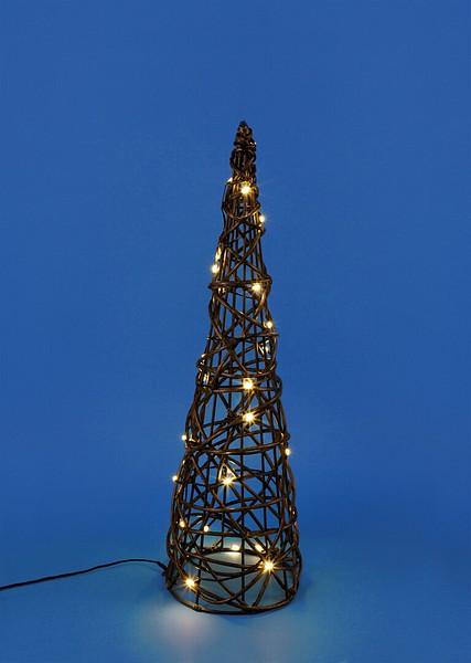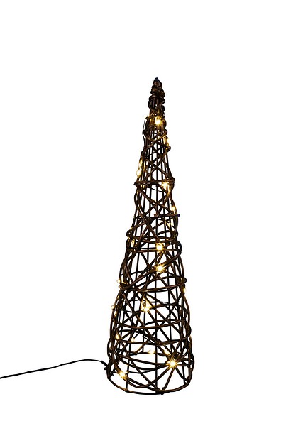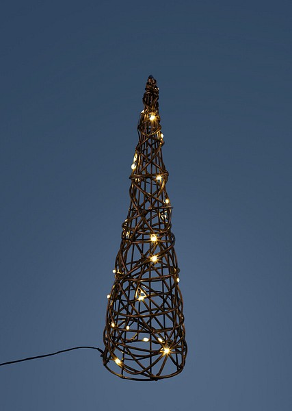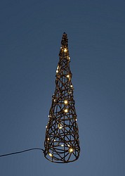A self-standing cone-shaped decorative light. Cozy and atmospheric on its own, stunning as part of a set of decorations! Brown polyrattan spun around a black metal frame. An LED light set has been wrapped around the frame, giving off a warm white light.