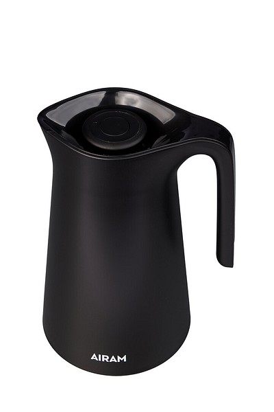 Stylish Novea thermal carafe, 1 L. Made of plastic with a glass liner. Body color: black. Screw-top lid with easy-to-use push button. The glass liner does not retain flavors – follow usage instructions carefully.