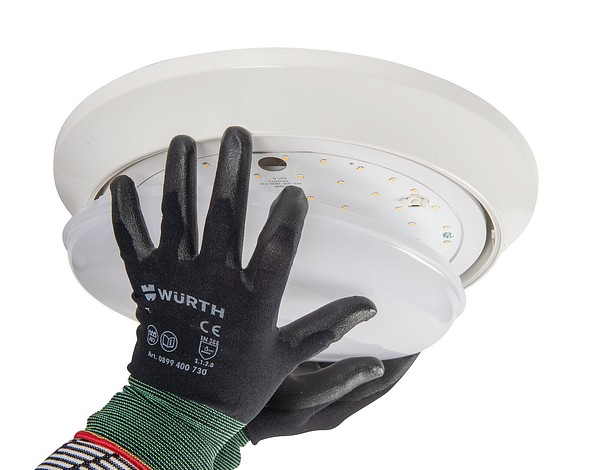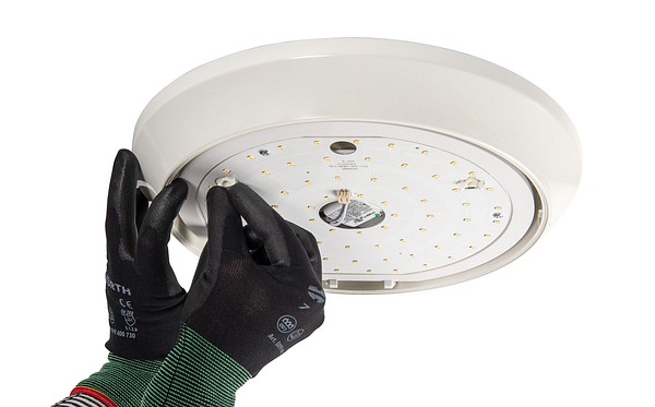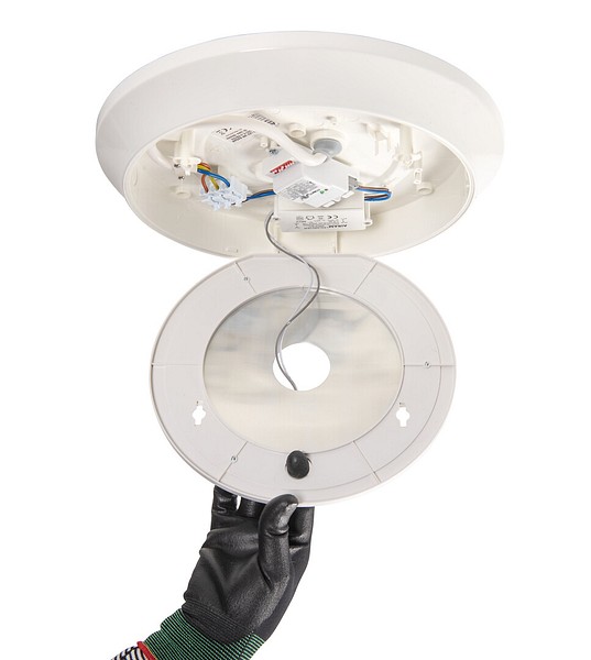 Rio 305 3000 K RA. A general-purpose light with a motion detector that is suitable for garages and car ports, for example; Ø 305 mm. IP44. IK10. Plastic frame (PC), opal plastic globe (PC), white. Non-replaceable LED 12 W 1 000 lm 3000 K. Surface-mounted directly onto a junction box, suitable for through-wiring. Useful life 35 000 h.