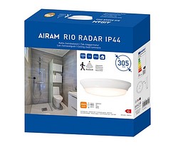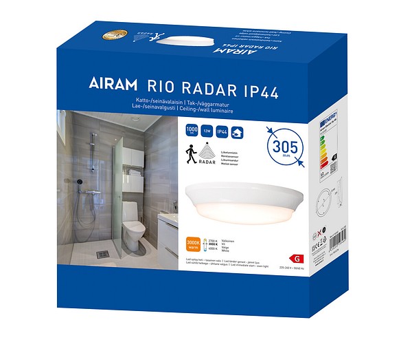 Choose the Airam Rio ceiling light for general lighting in indoor areas where the luminaire body and diffuser must withstand cold, heat and humidity. Suitable for operating temperatures from 0 … 25 °C, Rio can be installed directly onto a wall or ceiling junction box – ideal for bathrooms, utility rooms, garages and carports. Made of durable polycarbonate, the IP44 splashproof luminaires offer the highest impact resistance rating IK10 against mechanical shocks. The integrated LED provides even light distribution. Available in two colour temperatures: white 3000 K or cool white 4000 K. The radar sensor model features adjustable microwave detection range, time delay and dusk sensor settings.