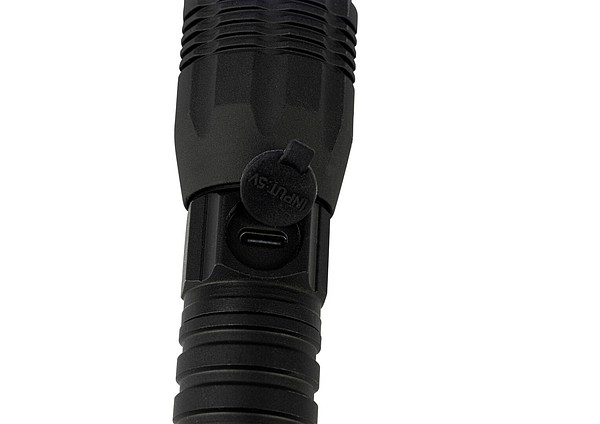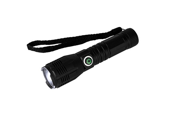 Compact flashlight with 500 lm light output, zoom function. Functions: bright, dim, flashing, SOS (long press). Light output: bright: 500 lm | dim: 300 lm. Operating time: bright: 2 h, dim 3 h, flashing: 2 h. Size and weight: 142 x 35 x 28 mm, 132 g. Battery: 1200 mAh Li-ion, USB-C-rechargeable.