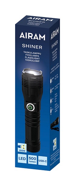 Compact and powerful flashlight with zoom function. The flashlight features a 500 lumen light output and three different lighting modes: bright, dim, flashing and SOS (long press). Its compact size makes it easy to use, and the zoom function allows you to focus the light as needed. The 1200 mAh Li-ion battery features convenient USB-C charging, and the operating time is up to 3 hours on the dim lighting mode. This flashlight is a handy companion for various situations.