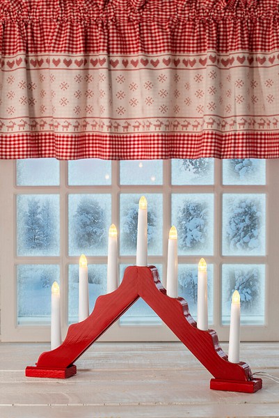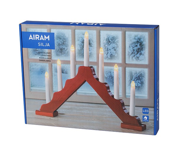 White, red or black LED candelabrum. LED warm yellow, non-replaceable, parallel connection. Material: wood. Clear cord. On/off switch.