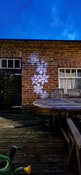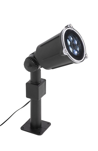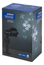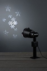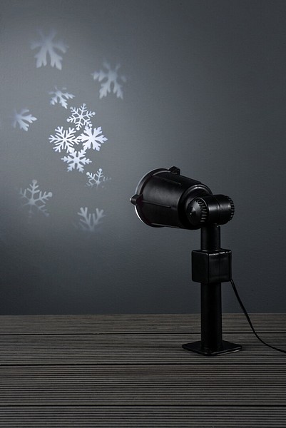 A projector for use indoors or outdoors under a roof. It projects snowflakes and star patterns with a rotating movement. Projection about 10 m2 at a distance of 3-5 m. The light can be turned and locked in a certain position. To be fastened either with screws or a ground spike. Do not direct the light to eyes. Do not let children use the projector. LED white, non-replaceable. Materials: metal and plastic. Dark cord.