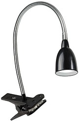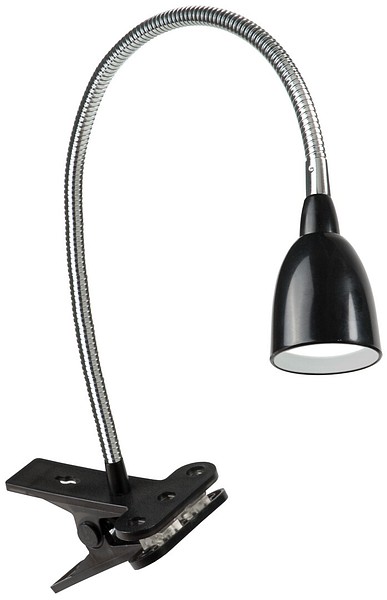 Stella Clip is a spotlight that clips on to the edge of a desk or shelf. The long, flexible arm allows you to direct the light where it is needed. Metal/plastic frame in black. Non-replaceable LED 3 W 280 lm 3000 K. Europlug, white 1.5-meter cable on/off switch.