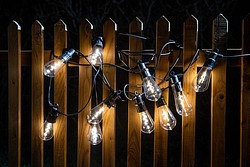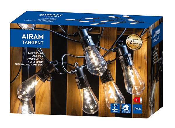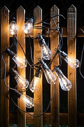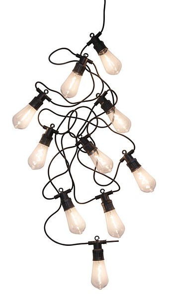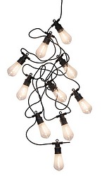 A set of ten highly effective LED lamps that is suitable for both indoor and outdoor use. The lamps feature clear Edison domes, with an impressive, coiled LED filament inside. Produces warm white light. Each lamp includes a handy hook for hanging. The lamps are spaced 50 cm apart, and the length of the light section is 4.5 meters. Black cord.