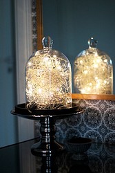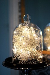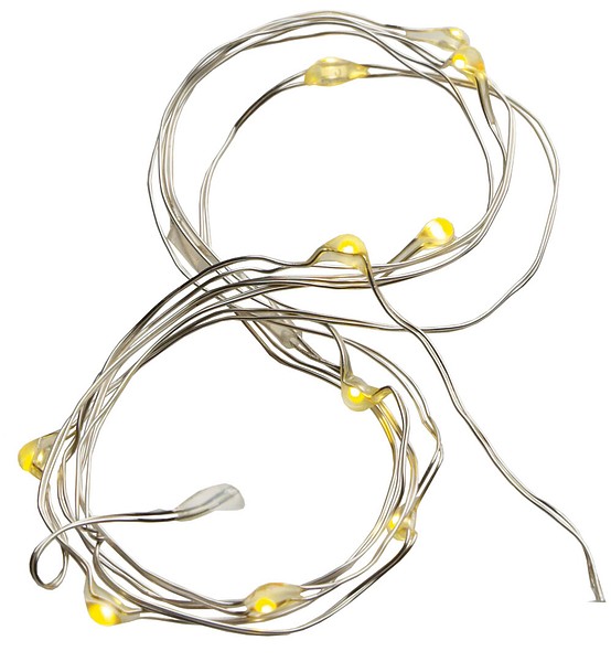 Beautiful silver-colored light string for versatile decoration. LED warm white, non-replaceable, wired in parallel. Includes batteries. Material thin metal wire with small embedded LEDs. On/off switch.