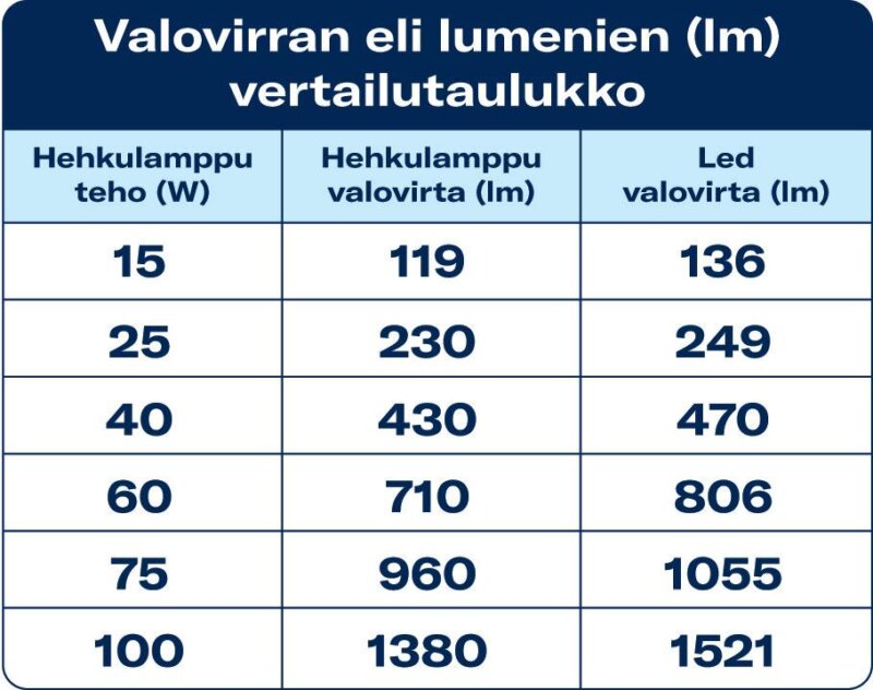 Lumen anger lampans ljusflöde, det vill säga hur starkt ljuset är. På Airams lampförpackningar visas lumen-värdet (lm) tydligt både med siffror och som en skala. Om du söker ljus motsvarande en ca 60 W glödlampa, välj en LED som ger ca 806 lm.