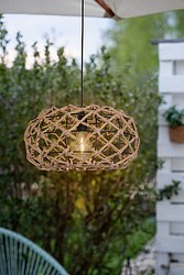 En elegant dekorationslampa i boho-stil – både för in- och utomhusbruk. Skärmen är täckt av en snodd, inuti lyser en fast LED-glödtrådslampa. Ljusets ton är varmvit, 2700 K. Kupans diameter 31 cm, höjd 14,5 cm. Upphängningssladd 80 cm. Fungerar med 4 x AA-batterier, batterifodral på upphängningssladden, batterier medföljer ej. Den batteridrivna lampan är lätt att hänga upp på den lilla kroken där man vill ha lampan. Innehåller en timer.