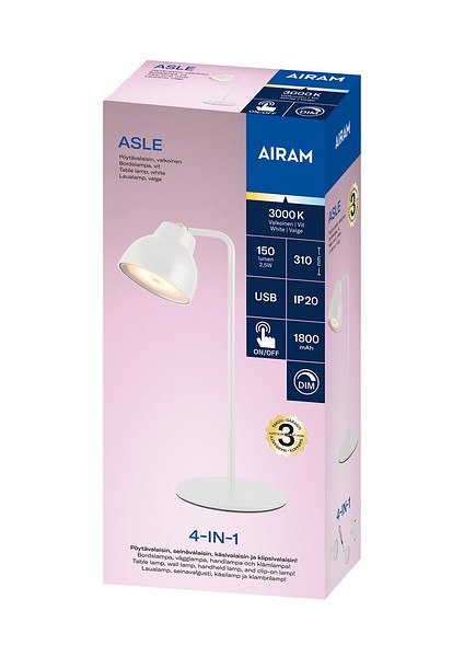 En behändig laddbar armatur, Asle, som kan användas som bordslampa, vägglampa, bärbar lampa eller clipslampa genom att byta lampkupan (Ø 9 cm, höjd 7 cm) till önskat underlag med hjälp av en magnetisk sugkopp. Alla nödvändiga delar finns i förpackningen. Vit stomme. Fast LED-lampa SMD 150 lm, 2,5 W, 3000 K. Steglöst dimbar. On/off-touchströmbrytare på lampskärmen. USB-A/USB-C -laddningskabel, medföljer, längd 1 m. Transformator ingår inte. Laddningstid ca 3 h, användningstid med 100 % ljusstyrka ca 3 h. Dimning 10–100 %, med lägsta ljusstyrka upp till 30 h driftstid.