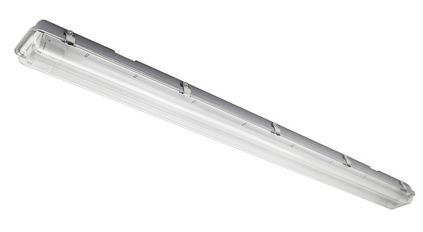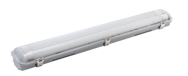 Damm- och vattentät allmänbelysning i IP65-skyddsklass bl.a. för garaget. Enkel att montera: tak-, vägg- eller upphängningsmontering. Kan sammanlänkas. LED-lysrör T8 G13 2 x 17,5 W 1800 lm 4000 K medföljer, utbytbart. Armaturens längd 1280 mm. Stomme av slitstark ABS-plast, grå. Skydd av genomskinlig plast.