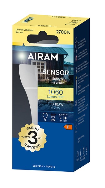 Opal, standardformad Sensor-serie LED-lampa med skymningssensor 10,7 W, färgtemperatur varmvit 2700 K, E27-sockel, 1060 lm, livslängd ca 25 000 h, storlek ø 60 x 120 mm, kartongförpackning. Frekvens ~50/60 Hz. Sensorlampan är avsedd för platser där ljus endast önskas i mörka miljöer. Under dagtid tänds ingen onödig belysning och energiförbrukningen minimeras, men i mörker tänds lampan automatiskt när ljusnivån sjunker under 15 lux. Lampan tänds omedelbart och ger full belysning även i kyla. Bra färgåtergivningsindex CRI > 80. Jämnt kontinuerligt spektrum, inga färgförvrängningar. Ingen UV- eller IR-strålning. Innehåller inget kvicksilver. Tre års garanti.