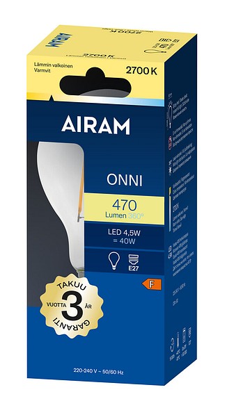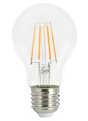 Klar standardkupolformad filament-LED-lampa 4,5 W, färgtemperatur varmvit 2700 K, E27-sockel, 470 lm, brinntid ca 15 000 h, storlek ø 60 × 108 mm, pappförpackning. Frekvens ~50/60 Hz. Lampan har en helt rundstrålande ljusfördelning och passar bra för plafonder och bordslampor. Arbetstemperaturområde –30 ... +40 °C. Bra färgåtergivningsindex CRI > 80. Jämnt och stabilt spektrum utan färgförvrängningar. Ingen UV- eller IR-strålning. Innehåller inte kvicksilver. Tre års garanti.
