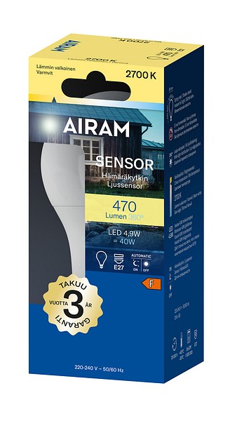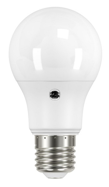 Sensor-serien LED-lampa med opal standardkupa och skymningssensor, 4,9 W, färgtemperatur varm vit 2700K, E27-sockel, 470 lm, livslängd ca 25 000 h, storlek Ø 60 x 110 mm, kartongförpackning. Frekvens ~50/60 Hz. Sensorlampan är avsedd för platser där ljus endast önskas i mörkare miljöer. Under dagtid tänds ingen onödig belysning eller förbrukning, men när belysningsnivån sjunker under 15 lux tänds lampan automatiskt. Lampan tänds omedelbart och ger fullt ljus även vid frost. God färgåtergivning CRI > 80. Jämnt kontinuerligt spektrum utan färgförvrängning. Inget UV- eller IR-ljus. Innehåller inget kvicksilver. Tre års garanti.